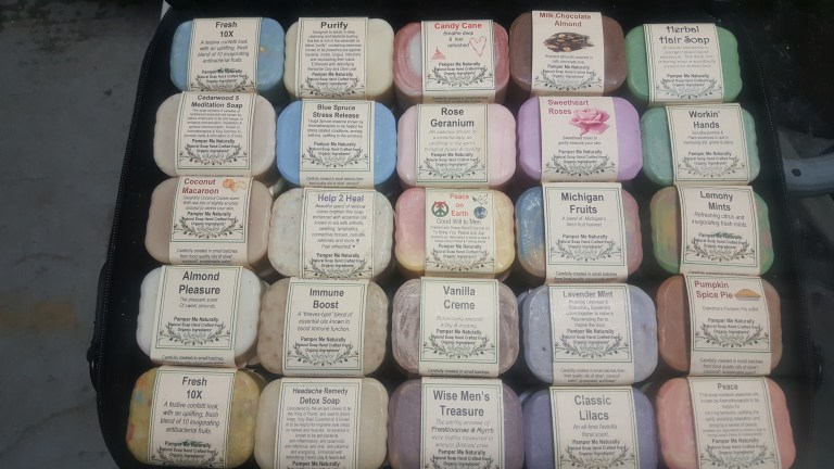 Scents available: Almont pleasure, Bugs away, Citrus and mints, Earth and sky, Green earth, Happiness spirit, Immune boost, Lavender garden, Lilac lane, Michigan fruits, Oatmeal soother, Patchouli peace, tea tree therapy, Simply naturally unscented and custom.
